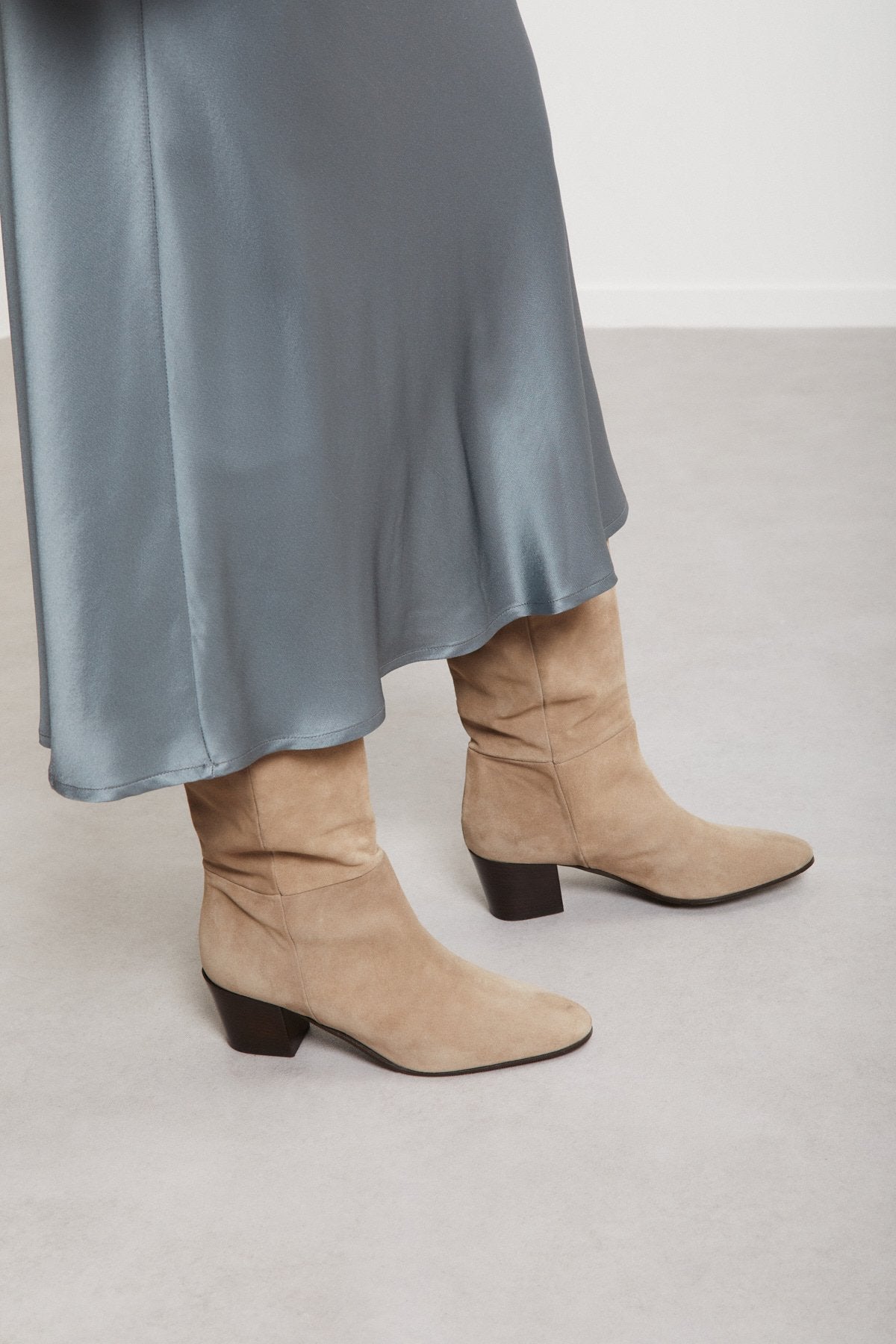 This dusty blue satin viscose midi skirt is perfect for fall. It looks great with boots or heels and matches nicely with a blouse or sweater.