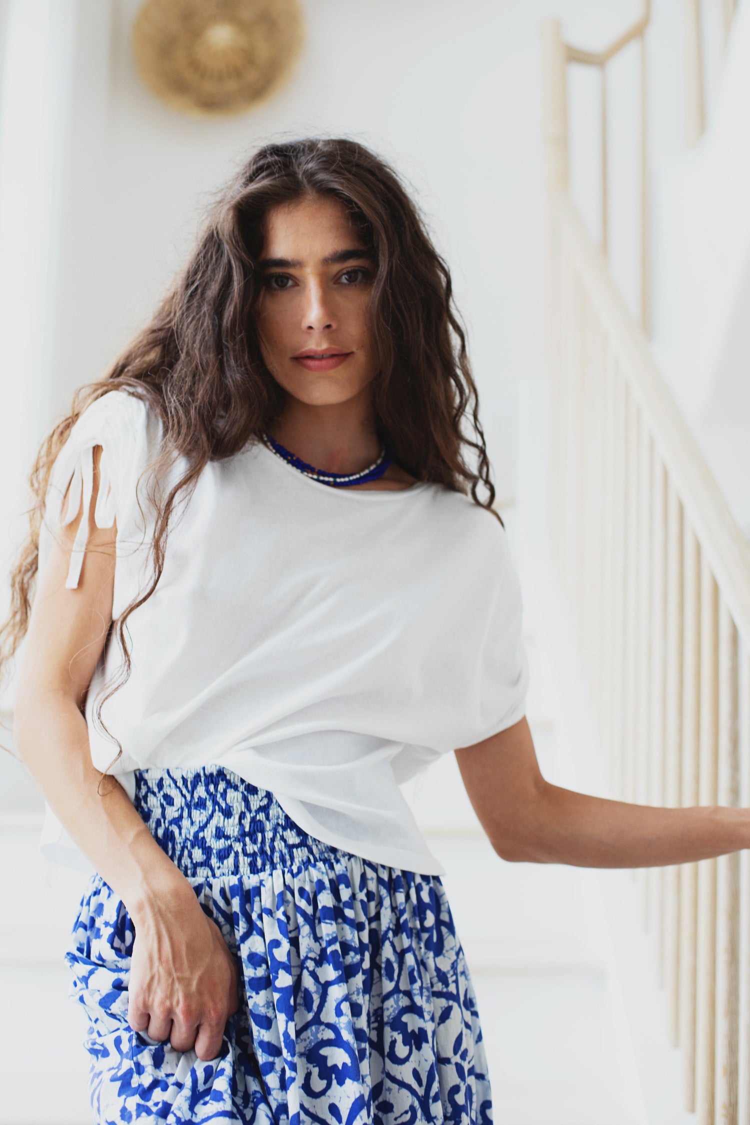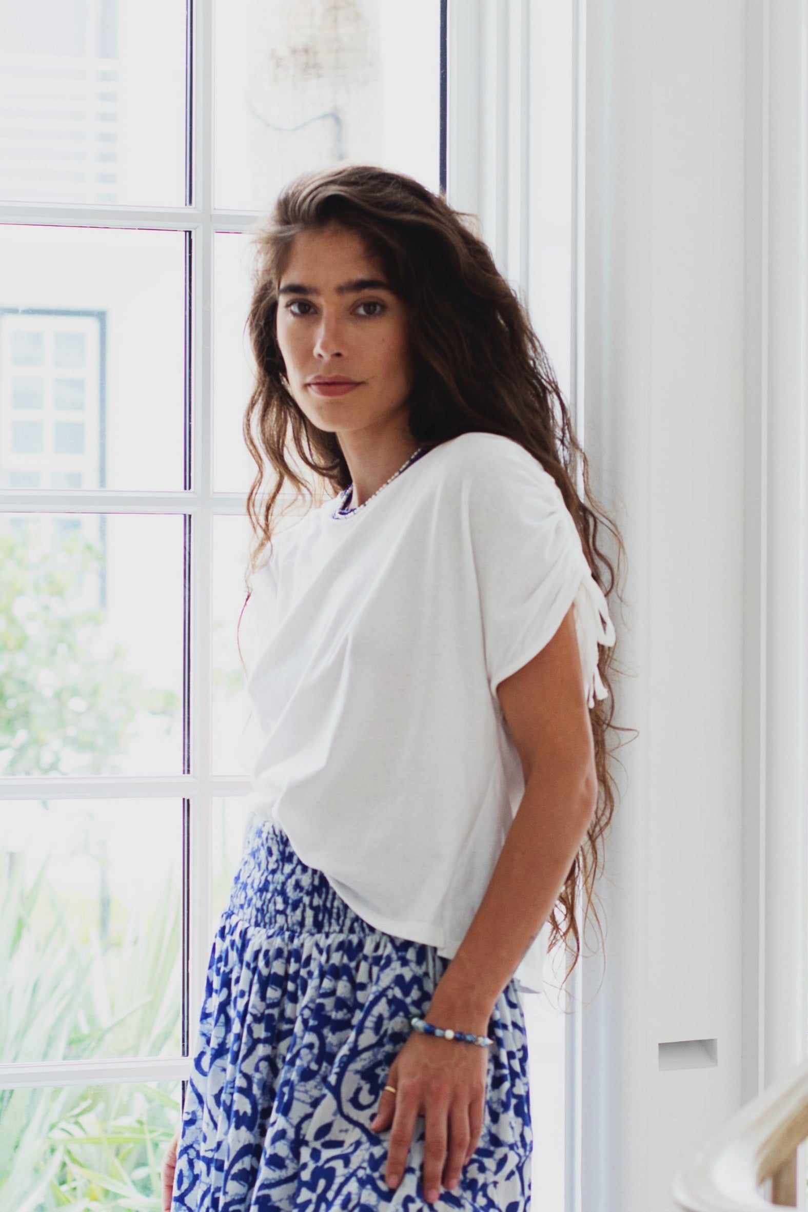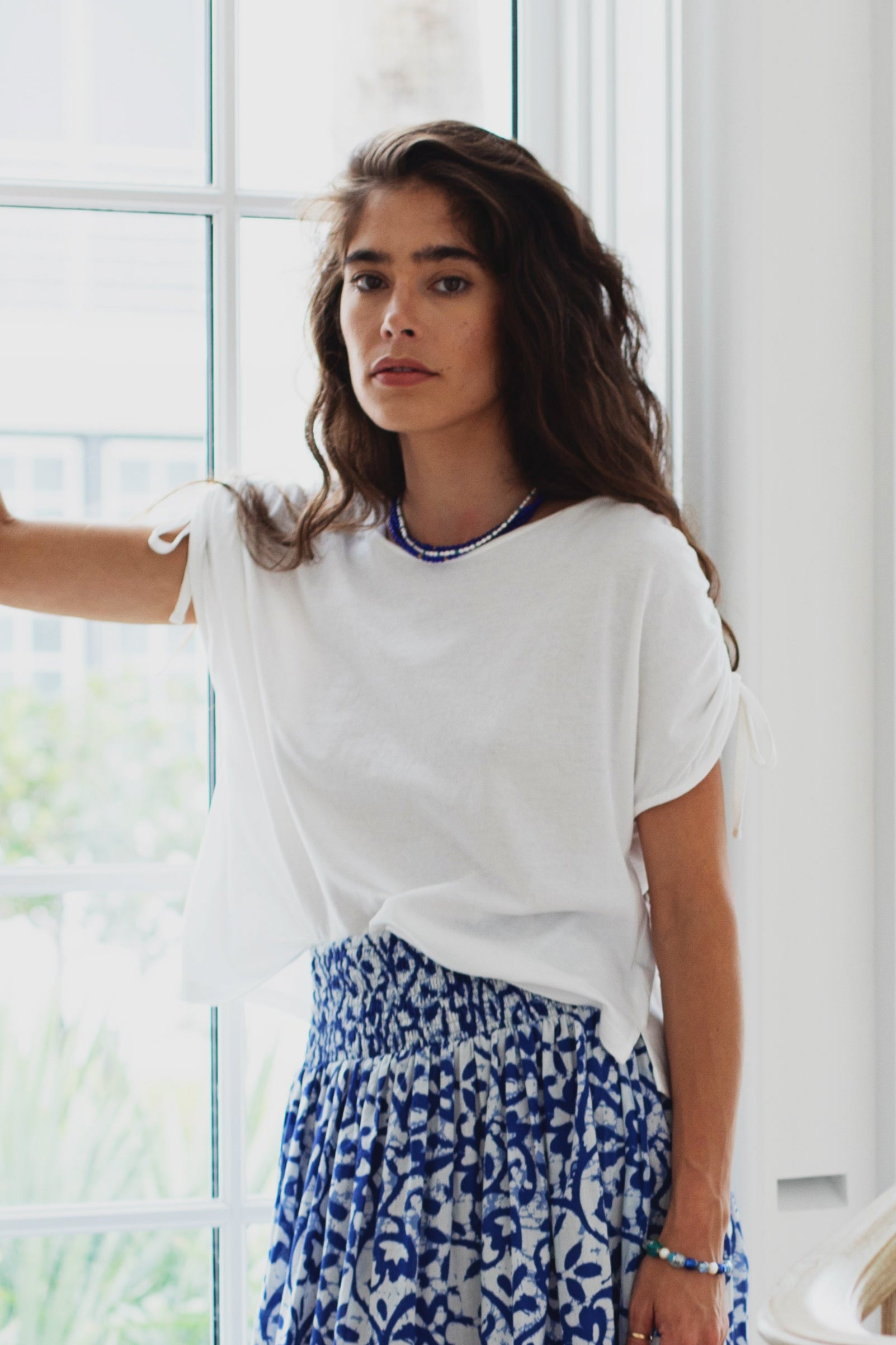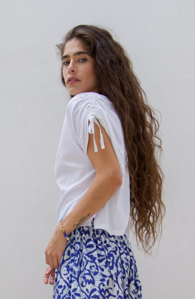 STYLE TIP: Elevate your basics with this sophisticated knit tee, featuring delicate ruching and adjustable tie details on the shoulders for a customizable look. Crafted from a soft, breathable cotton, it offers a comfortable yet flattering fit. Perfect for layering or wearing on its own, this versatile top is ideal for casual days or dressed-up looks, adding a feminine twist to any outfit.