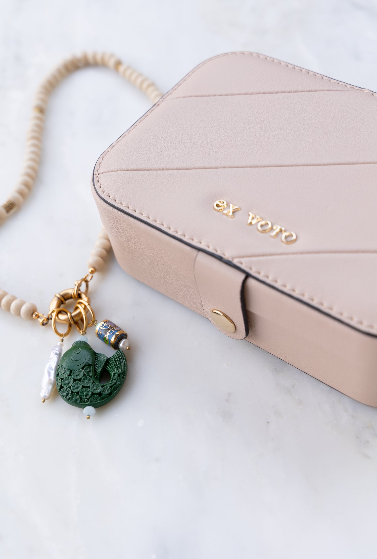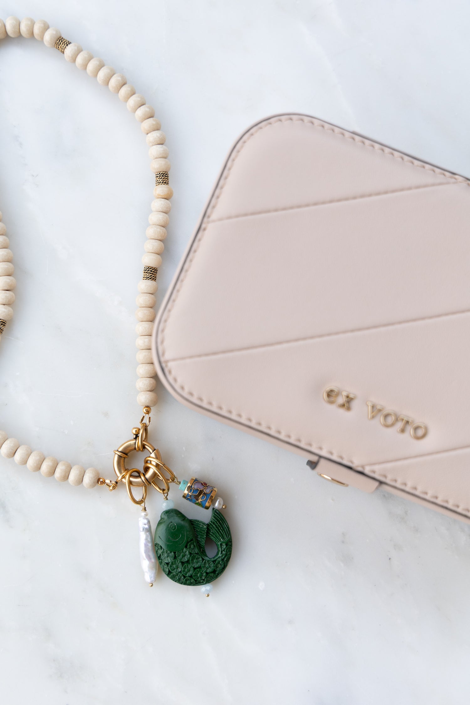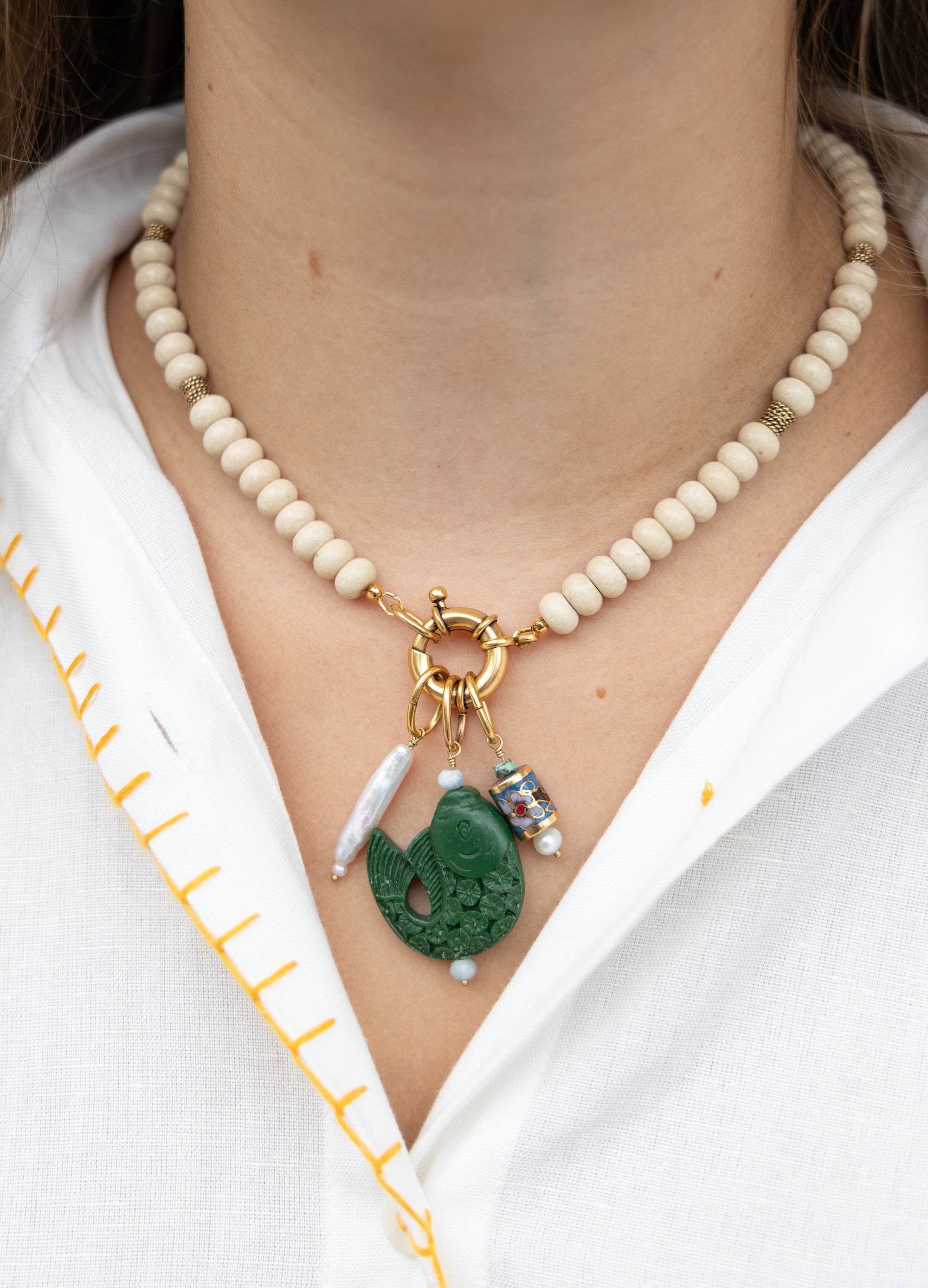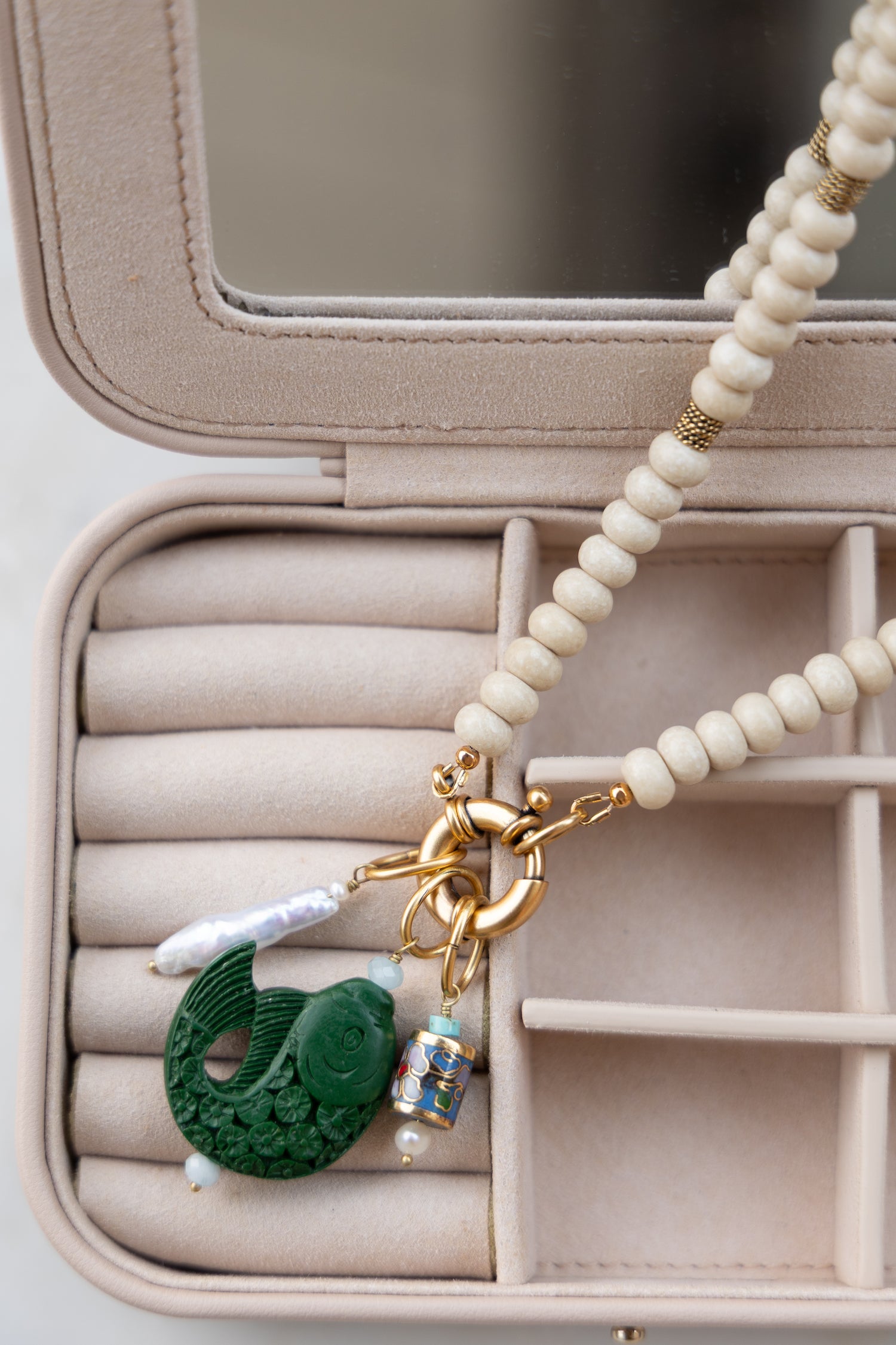 Discover the Summer Voyage Set, featuring three charms made from vintage components, freshwater pearl, and semi precious stones. This set includes the 18" Alyssa Necklace, Blue Cloisonne Charm, White Stick Pearl Charm, and Green Koi Fish Charm.