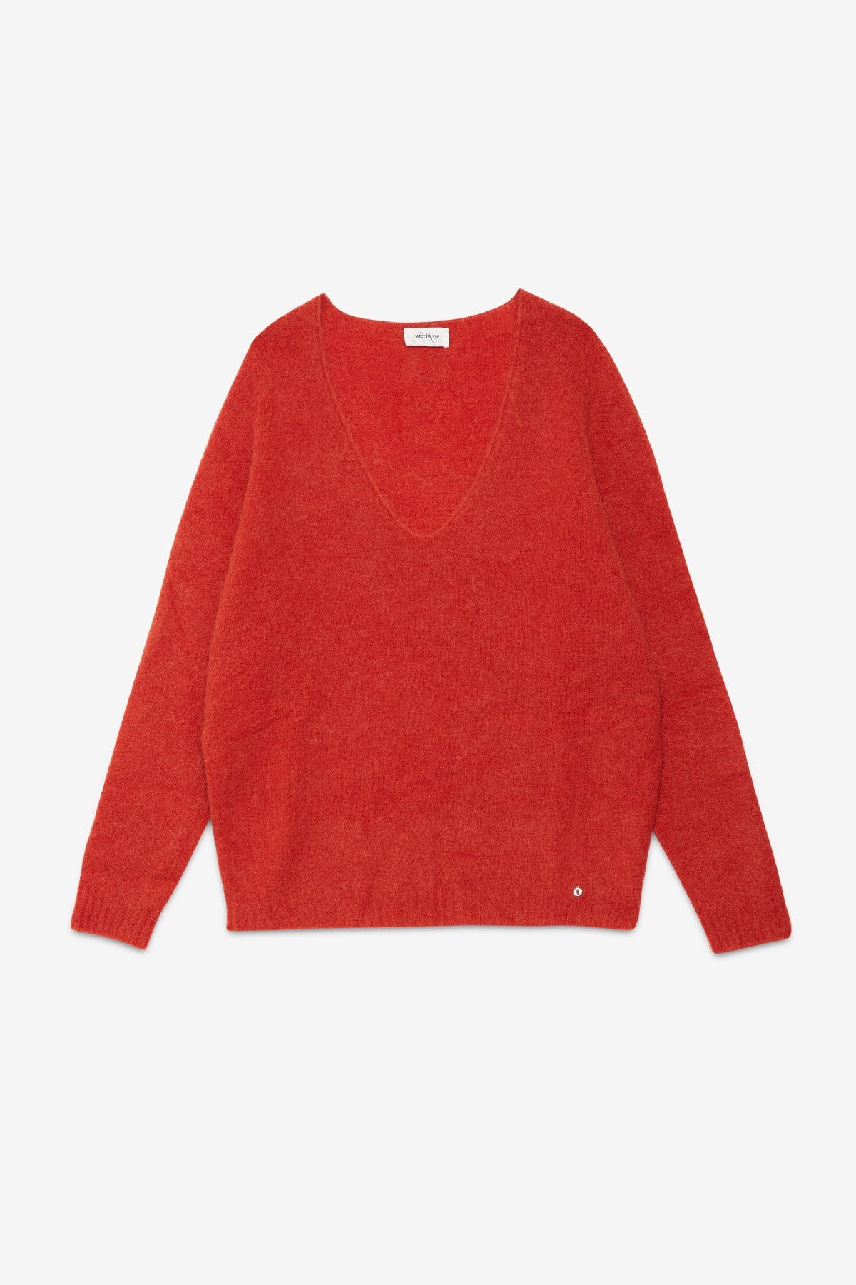 This wool blend sweater features a v-neck and comes in a lobster red shade, ideal for autumn and festive seasons.